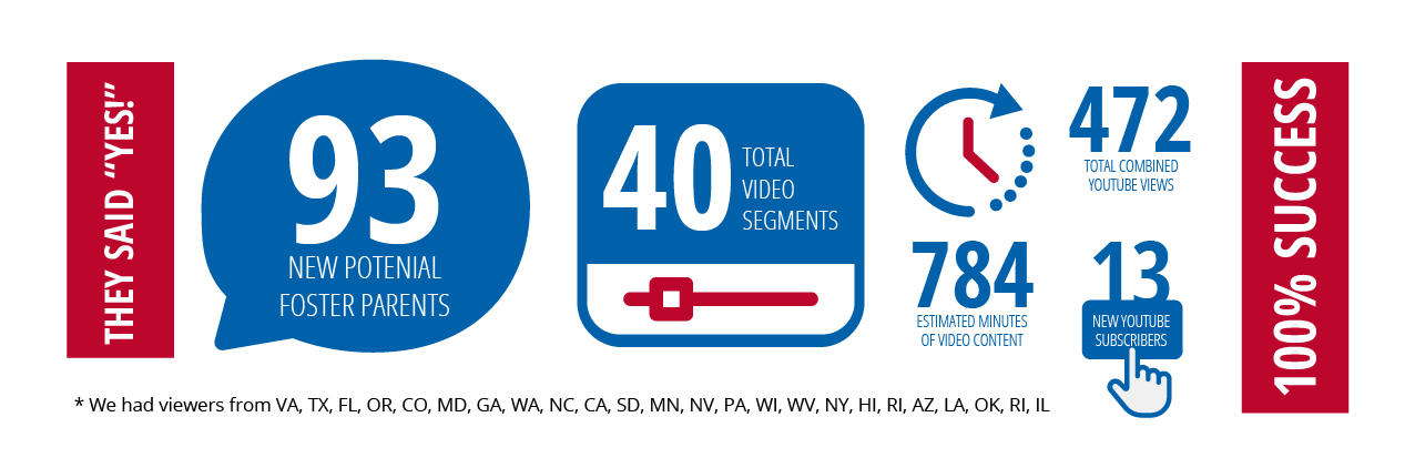 By adapting and leaning into the resources on hand, we produced over 40 video segments, reached an audience of over 400 users, and as a result signed-up close to 100 potential foster parents for training.